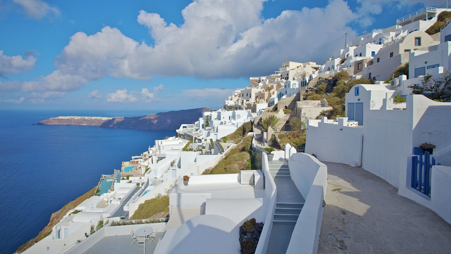 Santorini, Hy Lạp mang đến sự lãng mạn và thơ mộng với những ngôi nhà tường trắng mái xanh in bóng xuống mặt biển trong xanh ở Địa Trung Hải. Du khách có thể thưởng thức rượu vang trên sân hiên riêng tư, yên tĩnh trong khi ngắm mặt trời lặn xuống biển lấp lánh. Ảnh: expedia.