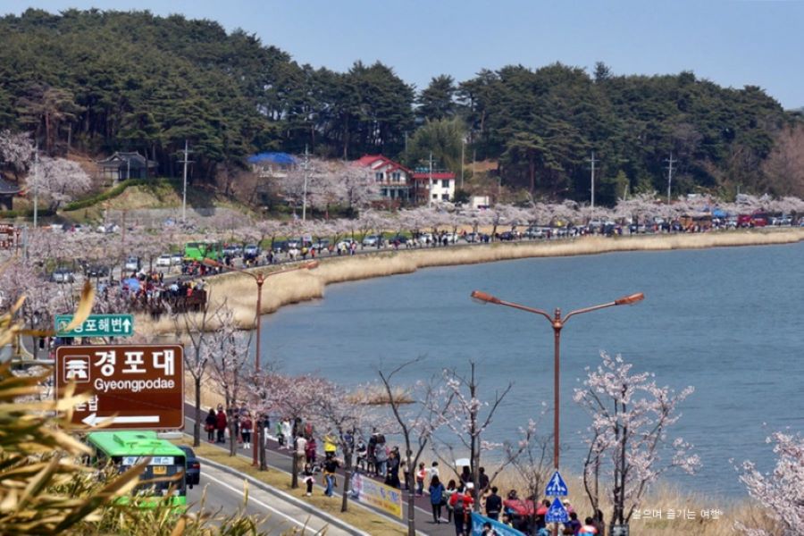 Bãi biển Gyeongpodae thuộc tỉnh Gangwon là một trong những địa điểm được xếp hạng là đẹp nhất Hàn Quốc, đặc biệt là vào khoảng thời gian mùa xuân, khi các gốc hoa anh đào chạy dọc bờ biển nở rộ vô cùng ấn tượng, để ngắm nhìn trọn vẹn những hàng hoa anh đào nở rộ du khách có thể trải bước trên những con đường gỗ được thiết kế dọc sát bờ biển.