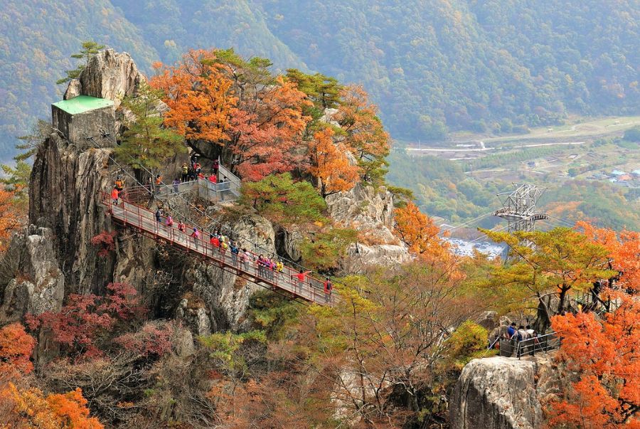 Núi Daedunsan là địa điểm nổi tiếng với cây cầu treo Geumgang nối liền hai vách đá, nơi khách đi tour Hàn Quốc có thể vừa chinh phục độ cao, vừa chiêm ngưỡng thảm lá đỏ trải dài bên dưới. Đặc biệt vào mùa thu, toàn bộ khu vực này như được bao phủ bởi màu sắc đỏ rực và vàng óng của những hàng cây thay lá, khiến hành trình leo núi trở nên đầy mê hoặc và thử thách.