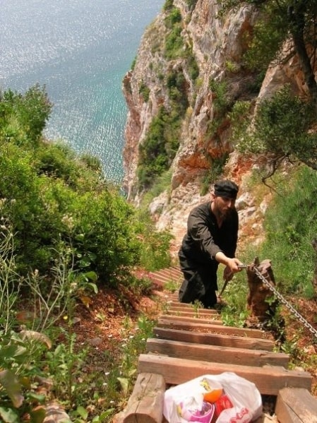 Con đường để di chuyển từ tu viện này đến tu viện kia rất nhỏ và nếu không cẩn thận có thể rớt xuống núi đá[/caption] Ngày xưa, để cho thể di chuyển được trên những ngọn núi, những ẩn sĩ sẽ tự lên núi bằng dây thừng và dây chuyền qua những vòng kẽm tạm thời. Ngày nay, họ thiết kế những bậc thang gỗ dốc đứng trên những vách đá để có thể lên và xuống núi. Tuy vậy, một số tu sĩ già yếu không đủ sức khỏe để có thể di chuyển bằng cách này và họ đã không rời nơi ở của mình trong hàng chục năm liền. [caption id="attachment_69104" align="alignnone" width="680"]