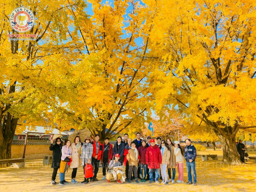 Cung điện Gyeongbokgung thực sự là một điểm đến lý tưởng để chiêm ngưỡng vẻ đẹp của mùa thu Hàn Quốc mà du khách có thể tham khảo. Cho những ai chưa biết, Cung điện Gyeongbokgung là cung điện hoàng gia đầu tiên và lớn nhất tại xứ sở kim chi mang nhiều nét kiến trúc cung đình cổ điển. Với những thảm lá vàng phủ đầy con đường nhỏ tạo thành tấm phông nền đầy diễm lệ, những tòa nhà truyền thống trầm mặc soi bóng trên mặt hồ tĩnh lặng hòa trong sắc thu nhẹ nhàng và lãng mạn, Cung điện Gyeongbokgung luôn có sức thu hút mạnh mẽ đối với các cặp đôi tình nhân và nhiếp ảnh gia đến từ khắp nơi trên thế giới. Đặc biệt khi màn đêm buông xuống bao trùm khắp mọi ngõ ngách cũng là lúc cung điện trở nên lung linh và rực rỡ hơn bao giờ hết với vô số ánh đèn chiếu rọi. Các buổi biểu diễn âm nhạc truyền thống tại cung điện hứa hẹn sẽ mang đến cho du khách phương xa những trải nghiệm vô cùng khó quên.