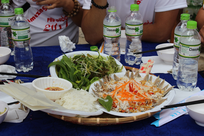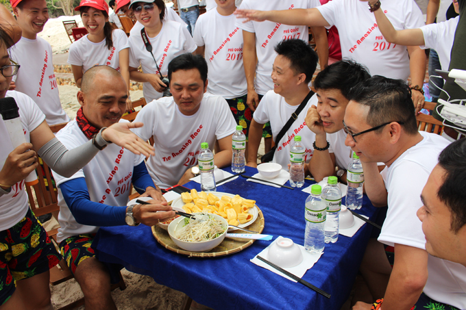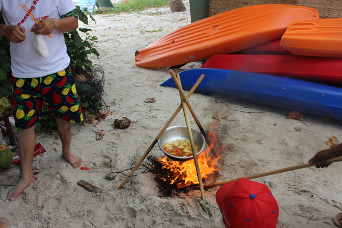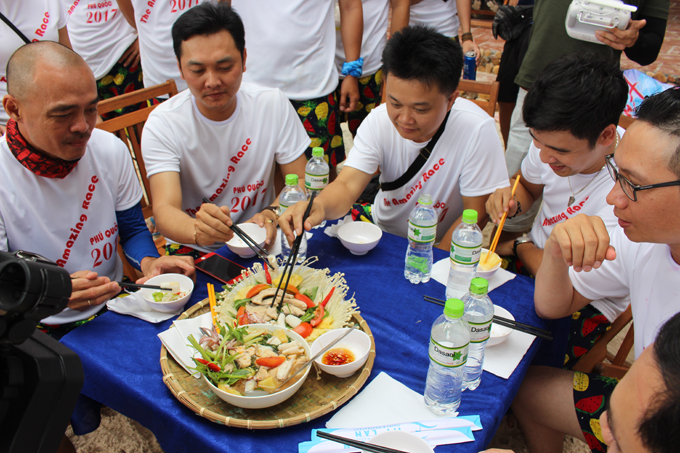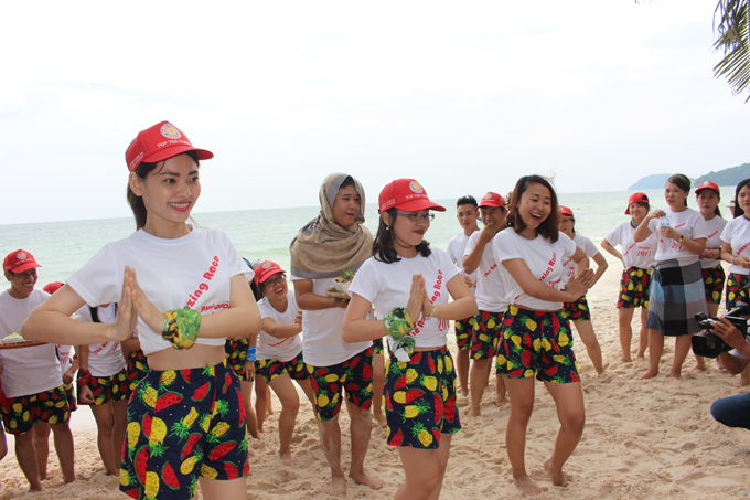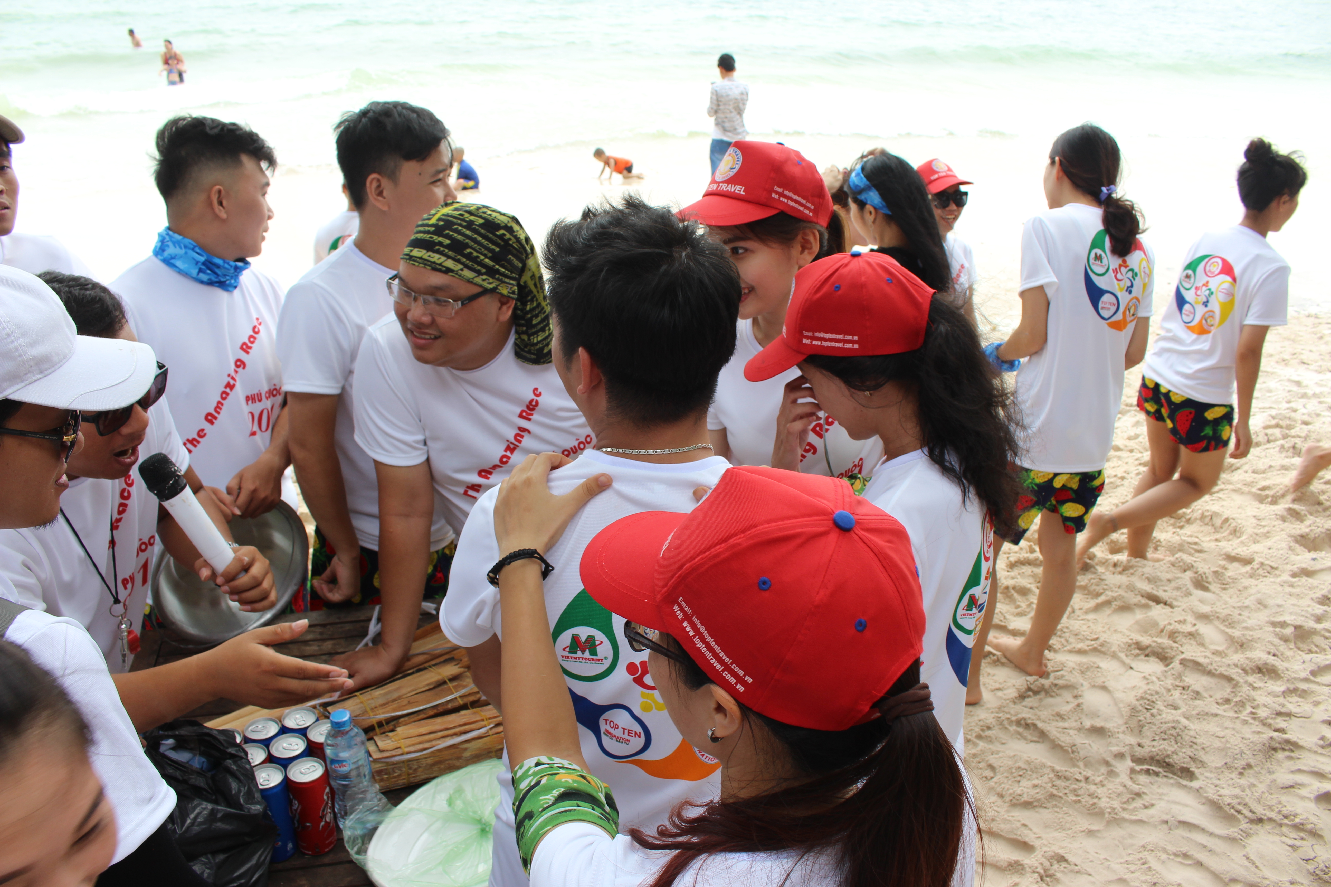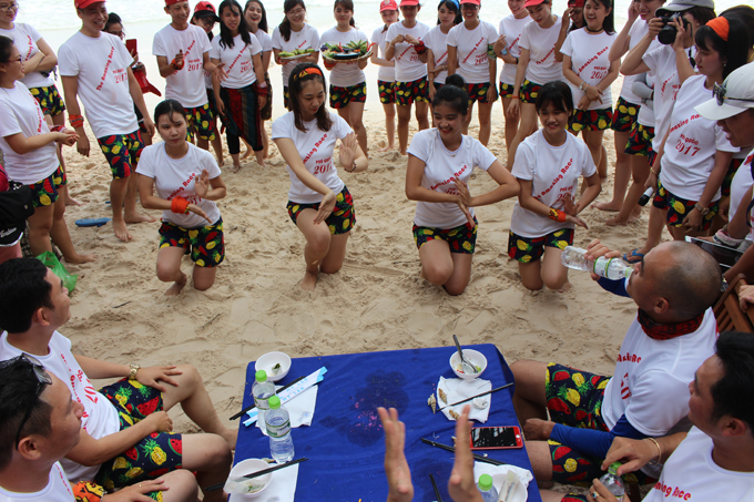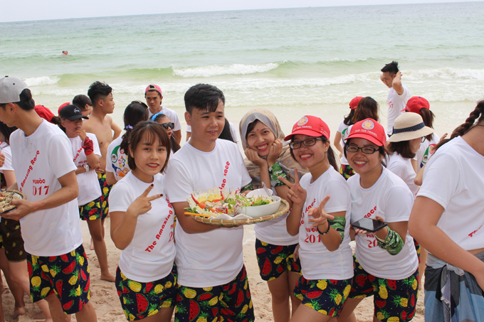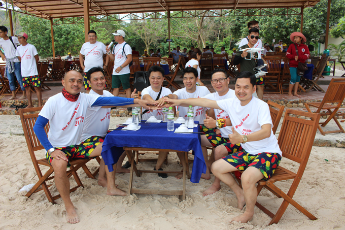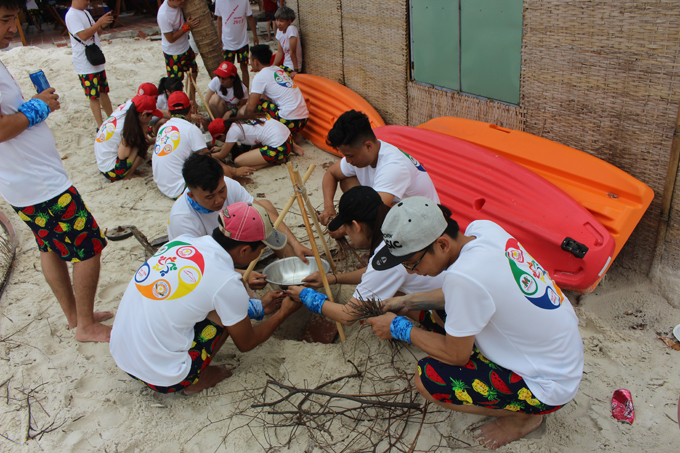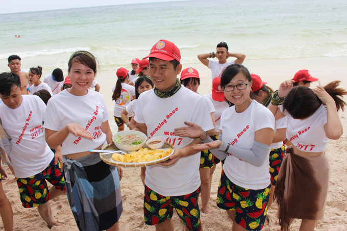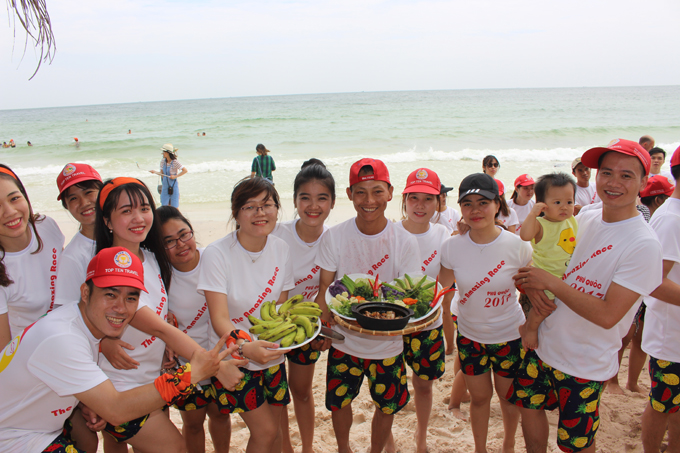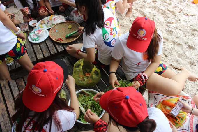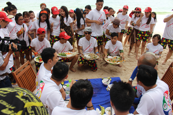 Team building ở bãi sao[/caption] Điểm nhấn của buổi team building chính là cuộc thi nấu những món ăn đặc sản của Phú Quốc để dâng lên Chúa đảo (các thành viên Ban Giám Đốc). Các đội tự nghĩ món ăn, tự đi chợ, tự chế biến và dâng lên để chúa đảo thưởng thức. 5 món ăn được dâng lên là 5 lần chúa đảo cũng như các thành viên Top ten Travel Group đứng ngồi không yên với màn múa dân vũ của các cô gái xinh đẹp đến từ mỗi đội. [caption id="attachment_68773" align="aligncenter" width="680"]