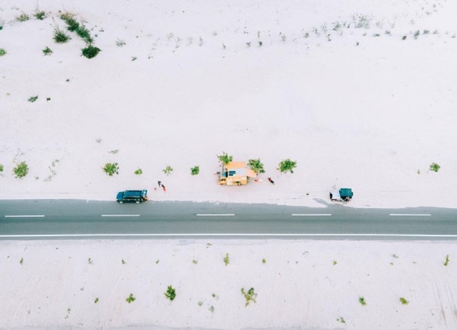 Được mệnh danh là "Tiểu sa mạc Sahara" của Bình Thuận, nhìn từ trên cao, toàn bộ cung đường được bao phủ bởi màu cát trắng xóa. Trên nền trời xanh ngắt, điểm một chút màu xanh của những rặng cây, Bầu Trắng trở thành địa điểm check-in siêu nghệ.