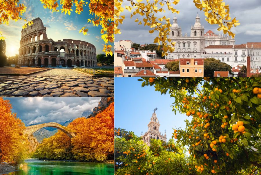 Nam Âu đón mùa thu với bầu không khí khô ráo, nhiều nắng và nhiệt độ dao động từ 15°C đến 25°C. Đây là địa điểm lý tưởng để khách đi tour Châu Âu có thể tham gia vào các hoạt động ngoài trời như tắm biển, dạo bộ qua những quảng trường lịch sử, hay ngắm hoàng hôn tại các thành phố ven biển. Một số điểm đến lý tưởng tại khu vực này vào mùa thu có thể kể đến như Rome (Ý), Seville (Tây Ban Nha), Lisbon (Bồ Đào Nha), Athens (Hy Lạp),.... Với những ai muốn kết hợp giữa khám phá văn hóa, lịch sử và nghỉ dưỡng nhẹ nhàng chắc chắn sẽ tìm thấy trải nghiệm lý tưởng tại các quốc gia Nam Âu vào mùa thu.