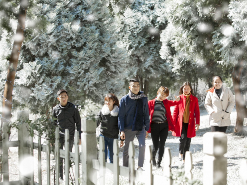 Tại đây có hàng ngàn cây bách xanh được phủ tuyết nhân tạo theo công nghệ mới. Các máy phun tuyết liên tục tạo hình ảnh lung linh trên khắp khu vườn. Con đường mòn dẫn lên khu vườn bách xanh lung linh ánh điện, cùng với những cỗ xe tuần lộc và tạo hình ông già Noel khổng lồ khiến cho giới trẻ mê mẩn, tái hiện một cảnh tượng Noel tuyệt đẹp chỉ được thấy ở châu Âu. Đặt chân tới đây du khách không chỉ được ngắm tuyết rơi, thưởng thức không gian ngập tràn tuyết trắng, du khách còn được ngắm khu vườn hoa hồng rộng hơn 3,5 ha với nhiều chủng loại khác nhau cùng hàng vạn bông hoa khoe sắc. Khu vườn hồng này đã được Hội kỷ lục Guiness Việt Nam trao bằng chứng nhận là Vườn hồng lớn nhất Việt Nam hồi Tháng 3-2019. [caption id="attachment_49990" align="aligncenter" width="900"]