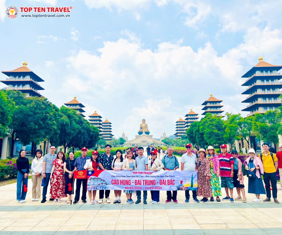 Cao Hùng không chỉ nổi tiếng với những khu chợ nhộn nhịp, sầm uất mà còn thu hút du khách bởi những ngôi chùa linh thiêng, cổ kính. Nổi bật trong số đó chính là Phật Quang Sơn, tọa lạc tại phía đông bắc làng Đại Thọ, được mệnh danh là "kinh đô Phật giáo" của Đài Loan và là nơi tọa lạc của trường đại học Phật giáo lớn nhất. Đến với địa điểm du lịch nổi tiếng tại Cao Hùng này, chắc hẳn bạn sẽ choáng ngợp trước khung cảnh tráng lệ, uy nghiêm của quần thể kiến trúc Phật giáo đồ sộ. Ngôi chùa được xây dựng liên tục trong 7 năm, từ năm 1967 đến năm 1974, với diện tích rộng lớn hơn 100 ha. Nơi đây sở hữu hơn 20 cung điện, lầu các, đường hành lễ và vô số pho tượng Phật uy nghi, trong đó có tượng Phật cao nhất thế giới - 108 mét. Ngay trước tượng Phật là hai dãy bảo tháp tạo thành hai bức tường dẫn vào tượng, tạo nên khung cảnh vô cùng tráng lệ và huyền bí.