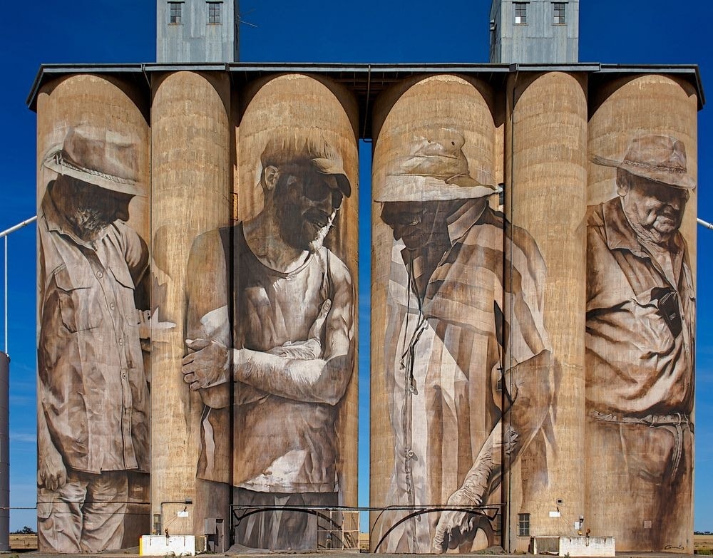 Tranh vẽ Merrilyn Horman[/caption] Tiếp tục về phía bắc "Silo Art Trail" bạn sẽ đến với Brim, nơi bức tranh tường nổi tiếng Guido Van Helten "Farmer Quartet" dần hiện ra. Cảnh mô tả bốn người dân Brim và đại diện của cộng đồng nông trại hạn hán. Bức tranh tường đã trở thành một mốc cho địa phương và là nguồn cảm hứng cho dự án Silo Art Trail. [caption id="attachment_67020" align="alignnone" width="680"]