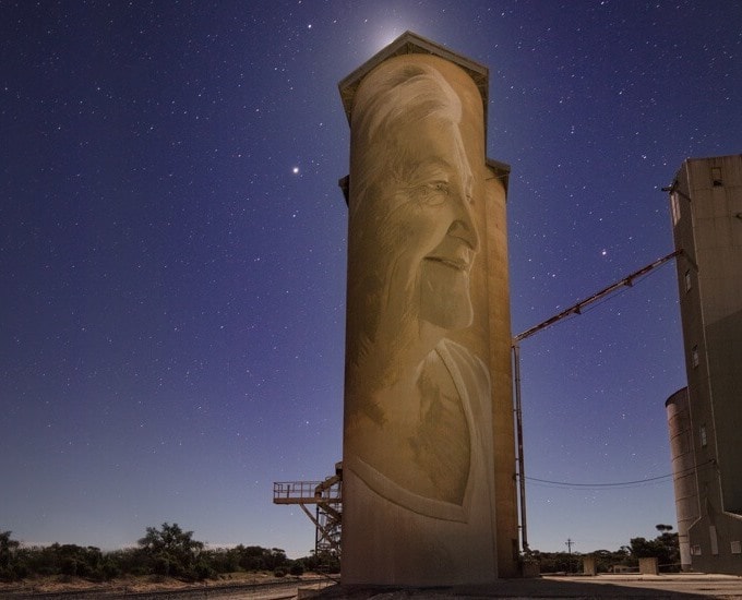 Trong hơn một trăm năm, các hầm hạt ngũ cốc trải dài trên vùng đồng bằng dọc theo vùng Wimmera-Mallee thuộc tiểu bang Victoria, luôn là cảnh quan xinh đẹp thu hút nhiều khách du lịch Úc. Bây giờ các tháp hạt mang trong mình một gu thẩm mỹ xinh đẹp khi chúng được chuyển đổi thành những tác phẩm nghệ thuật khổng lồ để vinh danh các nông dân vùng. [caption id="attachment_67013" align="alignnone" width="680"]