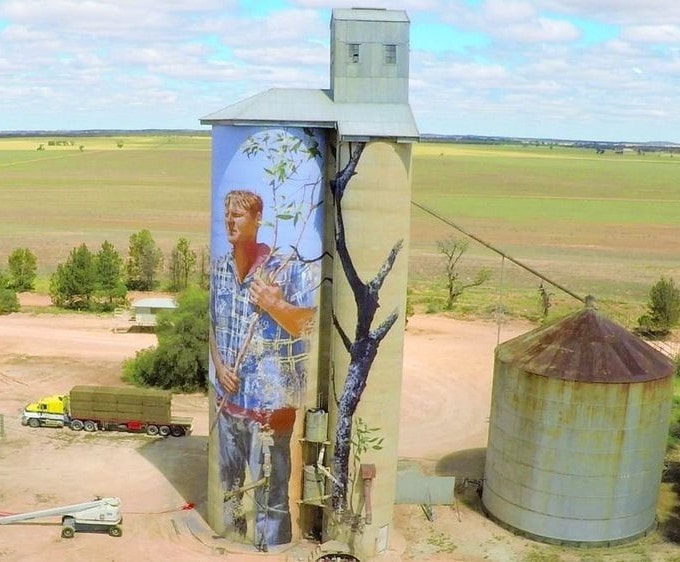 Tranh vẻ nông dân Geoff[/caption] Điểm đến tiếp theo trên đường mòn là Rosebery, nơi mà bức tranh vẫn chưa bắt đầu. Vì vậy, chúng tôi sẽ di chuyển đến trạm tiếp theo, Lascelles. Ở đây, nghệ sĩ đường phố Melbourne Rone đã vẽ chân dung thân mật của hai nông dân trồng lúa mì địa phương, Geoff và Merrilyn Horman, nhìn ra cảnh quan nông thôn. Gia đình Horman đã sống và sinh sống trong khu vực trong bốn thế hệ. [caption id="attachment_67021" align="alignnone" width="680"]