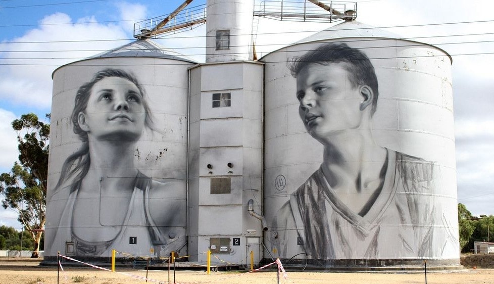 tBức ranh tường Guido Van Helten "Farmer Quartet"[/caption] Đường mòn bắt đầu tại Rupanyup, nơi nghệ sĩ người Nga Julia Volchkova vẽ bức tranh tường đơn sắc bao gồm hai cầu thủ bóng rổ Rupanyup địa phương - cầu thủ Ebony Baker và cầu thủ bóng đá Jordan Weidemann. Điểm dừng tiếp theo là Sheep Hills, nơi bức tranh tường lớn đầy màu sắc miêu tả bốn khuôn mặt bản địa đã được sơn trên sáu hầm hạt. Những bức chân dung cao chót vót có ý nghĩa tượng trưng cho người dân địa phương. [caption id="attachment_67018" align="alignnone" width="680"]