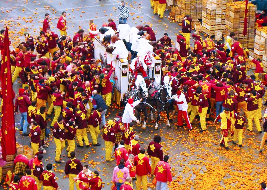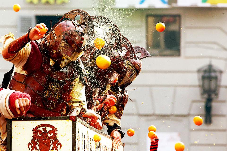 Nếu bạn có ý định tới du lịch Italy vào tháng 2 thì bạn không nên bỏ lỡ cơ hội tham gia lễ hội ném cam với tên gọi “Trận chiến với những trái cam” (Battle of the Oranges) tại Ivrea miền bắc Italia. “Trận chiến cam” là lễ hội được tổ chức vào tháng 2 hàng năm tại thành phố Ivrea. Người chơi sẽ nhóm lại thành nhiều đội và ném cam vào các đội đối thủ. Đây được xem là lễ hội ném thức ăn lớn nhất tại Italy. Khác với nhiều lễ hội cà chua nổi tiếng khác trên thế giới, "trận chiến" của người dân Ivrea sử dụng vũ khí là cam, Cam cũng là một loại đạn gây sát thương đáng kể hơn so với cà chua, vì vậy khi tham gia vào lễ hội độc đáo này, du khách nên sẵn sàng tâm lý cho những vết bầm tím. Các đội chơi tham gia chuẩn bị thiết bị “bảo hộ” rất nghiêm túc để đối phó với những cơn mưa cam bay thẳng vào mặt và đầu họ. [caption id="attachment_49016" align="aligncenter" width="900"]