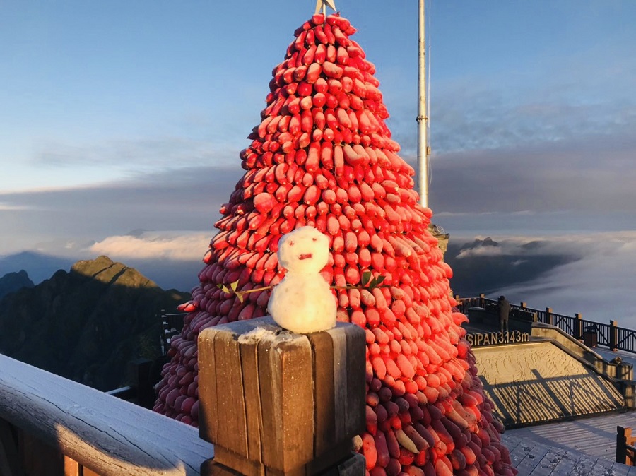 Năm nay, trên đỉnh Fansipan được trang trí một cây thông Giáng sinh khổng lồ được làm từ 1,5 tấn củ cải đỏ - một nông sản đặc trưng của Sa Pa