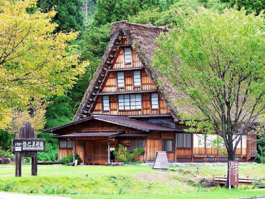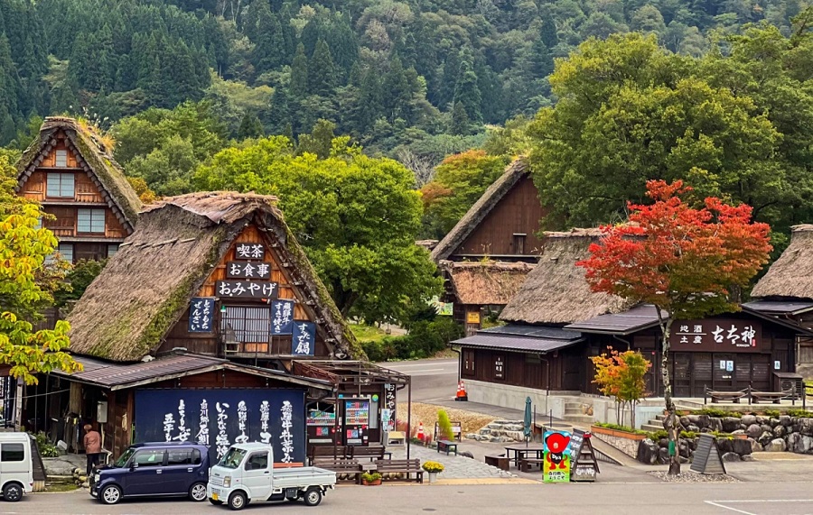 Điểm đặc biệt của ngôi làng này là những ngôi nhà gỗ mang kiến trúc gassh-zukuri có nghĩa là “chấp tay cầu nguyện”. Những ngôi nhà này được xây theo hướng Bắc hoặc hướng Nam để tránh gió cấp, mùa Đông thì ấm áp và mùa Hè thi lại mát mẻ dễ chịu. Kiểu nhà này đang được bảo tồn rất cẩn thận.