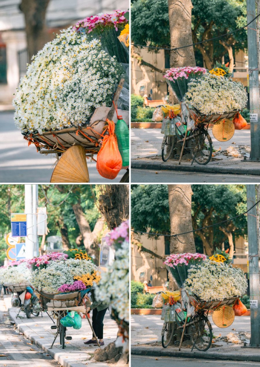 Mùa thu Hà Nội về, mang theo những chiếc xe hoa rực rỡ, trở thành một nét đặc trưng không thể thiếu trên những con phố cổ kính. Những gánh hoa đủ sắc màu, từ hoa cúc vàng tươi, hoa hồng nhung thắm đến hoa ly trắng tinh khiết, nhẹ nhàng khoe sắc dưới ánh nắng vàng nhạt của mùa thu. Hình ảnh những người bán hoa đạp xe len lỏi qua từng con ngõ nhỏ, hòa quyện vào khung cảnh phố phường, tạo nên một bức tranh sinh động, đầy màu sắc như góp phần tô điểm cho bức tranh mùa thu thêm phần lãng mạn và nên thơ.