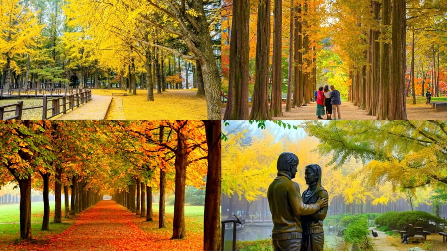 Khi những cơn gió heo may bắt đầu thổi về, Nami Hàn Quốc như khoác lên mình một tấm áo choàng lộng lẫy, rực rỡ sắc vàng, đỏ, cam, biến cả hòn đảo thành một bức tranh sơn thủy hữu tình, say đắm lòng người. Điểm nhấn của Nami vào mùa thu chính là hàng cây ngân hạnh và thủy sam huyền thoại. Những tán lá xanh mướt quanh năm giờ đây chuyển mình, ngả sang sắc vàng óng ả, tạo nên con đường tình yêu lãng mạn bất tận. Ánh nắng vàng dịu xuyên qua kẽ lá, trải dài trên lối đi, cùng với tiếng xào xạc của lá khô dưới chân, tạo nên một không gian vô cùng thơ mộng và lãng mạn.