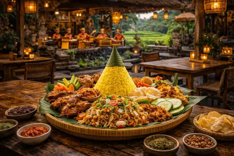Hiện nay, du khách có thể thưởng thức Nasi Tumpeng tại các nhà hàng truyền thống ở Ubud hoặc Denpasar với mức giá dao động từ 60.000 đến 150.000 Rupiah cho một phần cá nhân, tùy vào số lượng món ăn kèm. Khi tham gia hành trình Du lịch Bali, việc thử Nasi Tumpeng không chỉ là thưởng thức một món cơm đơn thuần mà còn là cách để bạn chạm vào chiều sâu văn hóa ẩm thực của hòn đảo này.