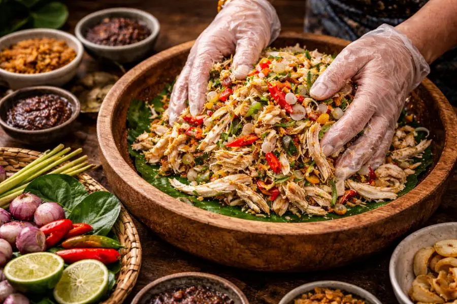Thành phẩm sau khi áp dụng các bước trên là món gỏi gà có màu sắc bắt mắt, vị ngọt tự nhiên của thịt hòa quyện cùng hương thơm nồng và vị cay dịu của sambal matah. Ngày nay, món ăn này thường xuất hiện trong bữa cơm gia đình và cũng rất được yêu thích trong hành trình Du lịch Bali nhờ sự thanh nhẹ nhưng vẫn đậm đà đặc trưng.