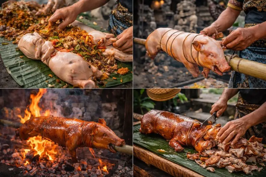 Babi Guling là món ăn biểu tượng của Bali, đặc biệt phổ biến trong các buổi lễ tôn giáo và sự kiện cộng đồng quan trọng của người Hindu. Heo sữa được làm sạch kỹ lưỡng, sau đó nhồi đầy hỗn hợp gia vị truyền thống vào bụng rồi quay nguyên con trên than hồng trong nhiều giờ liên tục. Quá trình quay đòi hỏi sự kiên nhẫn và kinh nghiệm để lớp da đạt độ giòn hoàn hảo mà phần thịt bên trong vẫn giữ được độ mềm ngọt tự nhiên.