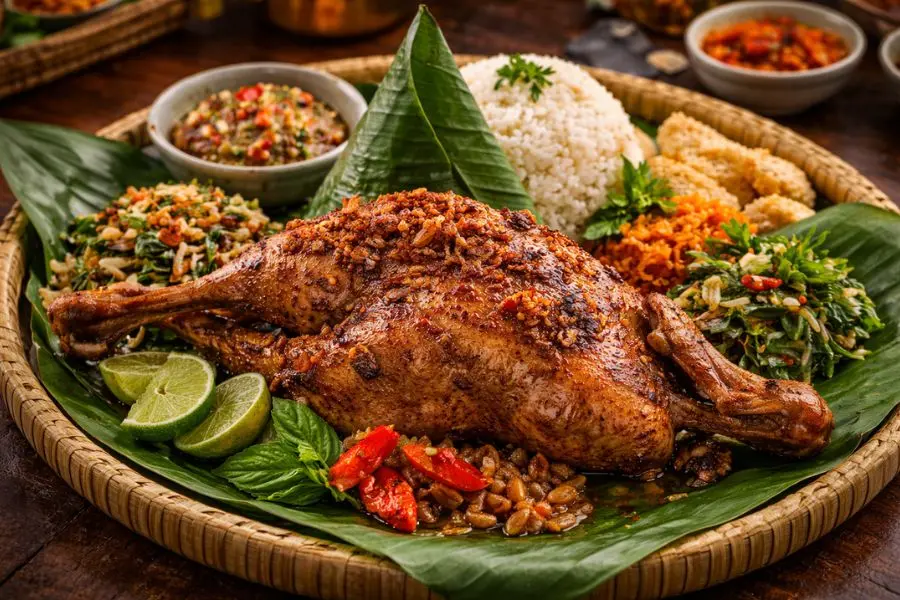 Bebek Betutu là một trong những món ăn truyền thống nổi tiếng nhất của Bali và thường xuất hiện trong các dịp lễ quan trọng. Món vịt này được chế biến công phu với nhiều bước tẩm ướp và nấu chậm trong nhiều giờ. Người dân địa phương thường chọn vịt thả đồng để đảm bảo độ chắc thịt và vị ngọt tự nhiên.