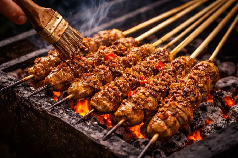 Satay là món ăn đường phố phổ biến tại Bali và khắp Indonesia. Những xiên thịt nhỏ được tẩm ướp gia vị kỹ lưỡng rồi nướng trên than hồng tạo nên mùi thơm quyến rũ khó cưỡng. Nguyên liệu chính của món Satay thường là gà, bò hoặc heo, được cắt thành miếng vừa ăn rồi ướp kỹ với nước cốt dừa cùng các loại gia vị như sả, nghệ, tỏi và hành tím. Chính hỗn hợp này tạo nên hương thơm đặc trưng, vừa béo nhẹ vừa đậm đà. Sau khi thấm gia vị, thịt được xiên vào que tre và nướng trên than hồng. Khi nướng, người bán liên tục trở tay để thịt chín đều, lớp ngoài xém nhẹ, dậy mùi thơm quyến rũ nhưng bên trong vẫn giữ được độ mềm và mọng nước.