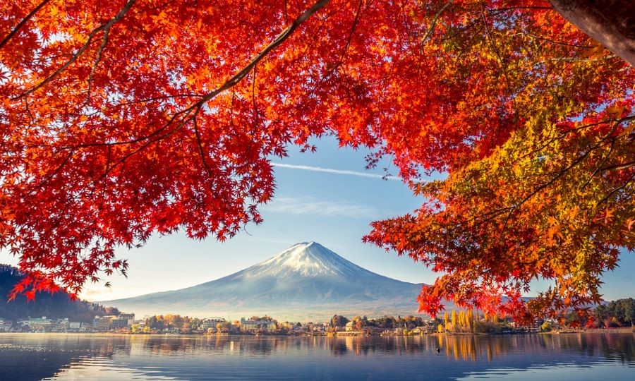 Sẽ thật thiếu sót nếu bạn bỏ qua Núi Phú Sĩ khi đến thăm Nhật Bản vào mùa lá đỏ này. Bên cạnh ngọn núi Phú Sĩ - biểu tượng đặc trưng của nước Nhật, bạn sẽ được chiêm ngưỡng những chiếc lá đỏ rực rỡ khi vào thu in bóng lên làn nước trong xanh, yên ả của mặt hồ. Tất cả những điều này đã góp phần tạo nên một bức tranh thiên nhiên đẹp đến khó tả.