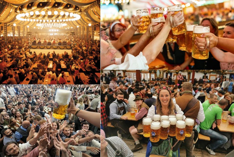 Lều bia khổng lồ: Oktoberfest có hơn 30 lều lớn nhỏ, mỗi lều chứa từ 1.000 – 10.000 người. Mỗi lều thuộc về các hãng bia nổi tiếng như Paulaner, Spaten, Augustiner… với thiết kế trang trí độc đáo, âm nhạc sống động và phục vụ các món ăn đặc trưng Bavaria.