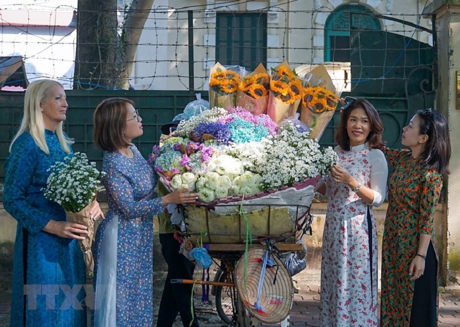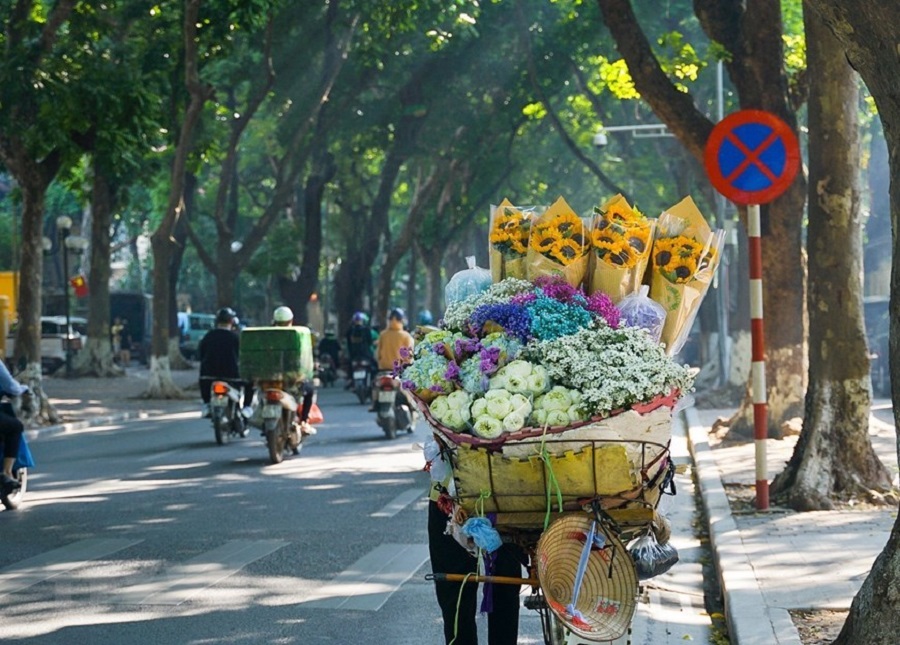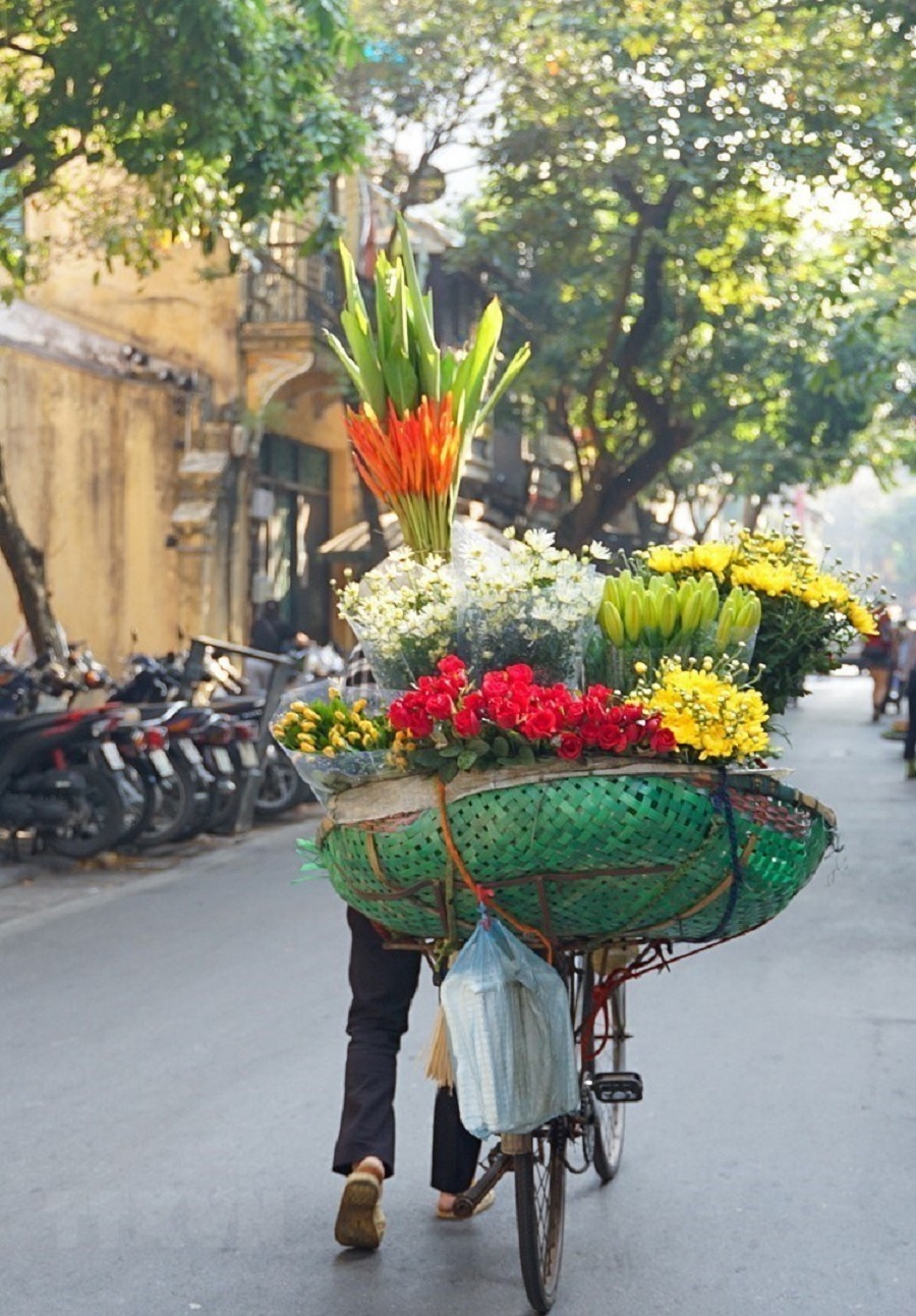 Chỉ cần nhìn vào các loại hoa, sắc hoa riêng trên xe, người ta có thể biết được Hà Nội đang ở mùa nào. Ảnh: Khánh Hoà/TTXVN.