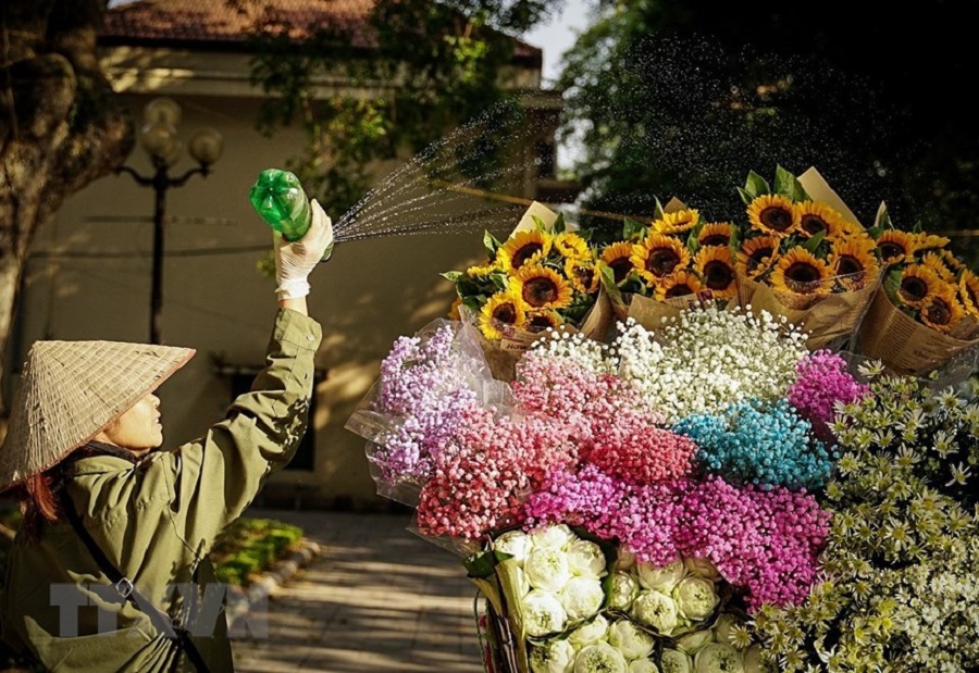 Các loại hoa được tưới thường xuyên để đảm bảo độ tươi trong cả ngày. Ảnh: Khánh Hoà/TTXVN.