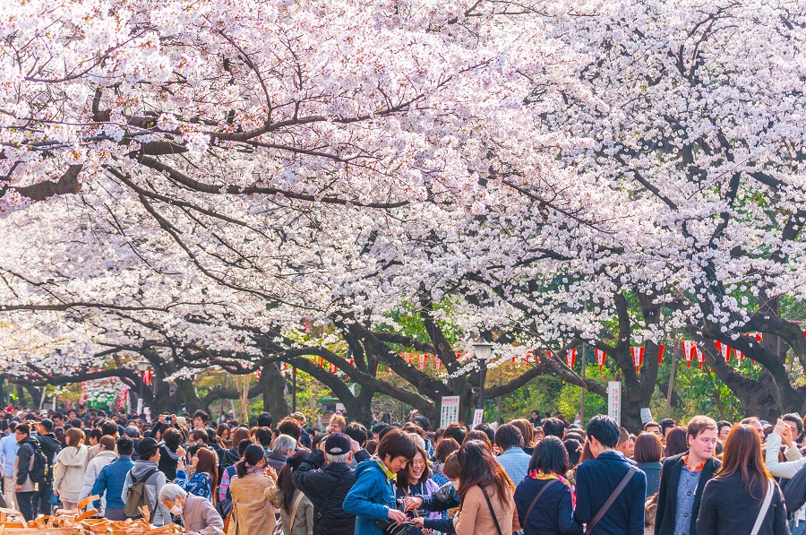 Ueno là địa điểm nổi tiếng để ngắm hoa anh đào ở xứ sở mặt trời mọc, hai bên con đường chính giữa công viên có hơn 1,200 cây hoa anh đào khoe sắc hồng rực rỡ trong công viên rộng 54 héc-ta. Hàng năm, nơi đây thu hút đông đảo du khách đến trải nghiêm “Hanami” hay ngắm hoa anh đào và tổ chức dã ngoại ngay dưới tán cây cùng gia đình, người thương và bạn bè.