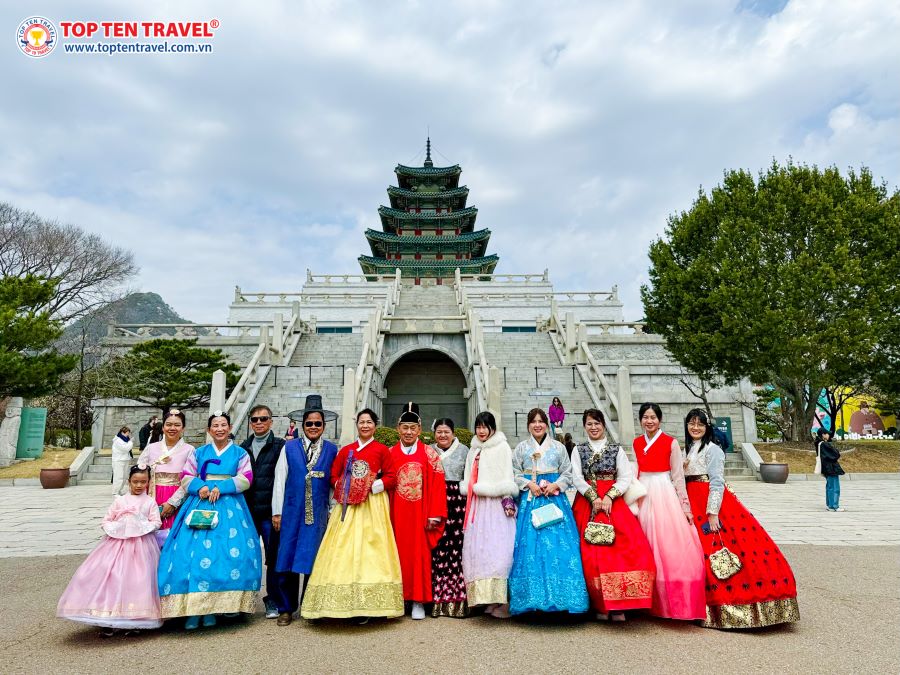 Nhắc đến những địa điểm du lịch Hàn Quốc nổi tiếng thì không thể bỏ qua Cung điện Gyeongbokgung. Nơi đây thu hút du khách bởi vẻ đẹp tráng lệ, cổ kính và đậm đà bản sắc văn hóa xứ sở kim chi. Bước chân vào Gyeongbokgung, bạn như lạc bước vào một thế giới hoàn toàn khác, nơi thời gian như ngừng lại, đưa bạn về với triều đại Joseon huy hoàng trong lịch sử Hàn Quốc. Từng mái ngói cong cong, từng bức tường rêu phong, từng hoa văn tinh xảo đều mang đậm dấu ấn của thời gian và toát lên khí chất uy nghi, tráng lệ. Điểm nhấn đầu tiên chính là cổng Gwanghwamun đồ sộ, cánh cổng chính dẫn vào cung điện. Chiêm ngưỡng cổng Gwanghwamun, bạn sẽ cảm nhận được sự uy quyền và tầm vóc của vương triều Joseon năm xưa. Tiếp tục tiến vào bên trong, bạn sẽ choáng ngợp trước kinh Kyeongbokgung, nơi ở chính của vua Joseon. Điện Kyeongbokgung với kiến trúc nguy nga, tráng lệ, là biểu tượng cho quyền lực tối cao của vua chúa thời bấy giờ.