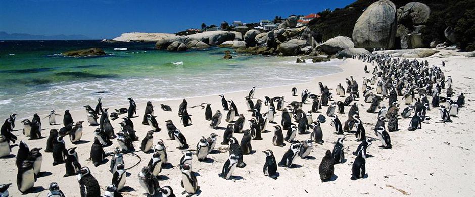 Bãi biển Boulders Nằm cạnh thị trấn Simon, cách bán đảo Cape (Nam Phi) 40km, bãi biển Boulders là nơi sinh sống của hàng ngàn chú chim cánh cụt Châu Phi. Dẫu rằng loài chim này đã kịp báo hiệu sự có mặt của mình bằng tiếng kêu inh ỏi khi du khách còn cách xa vài dặm, nhưng giây phút nhìn thấy những đốm đen trắng lít nhít trên bờ cát, không ít người vẫn ngỡ ngàng. Đến đây du khách không cần đến các hoạt động như lặn ngắm san hô, hay lướt sóng trên biển, bạn chỉ cần nằm dài trên bờ biển nhìn lũ chim chân ngắn này lạch bạch kiếm ăn hay ngáo ngơ trước con người cũng đủ cảm thấy vui vẻ. [caption id="attachment_48031" align="aligncenter" width="900"]