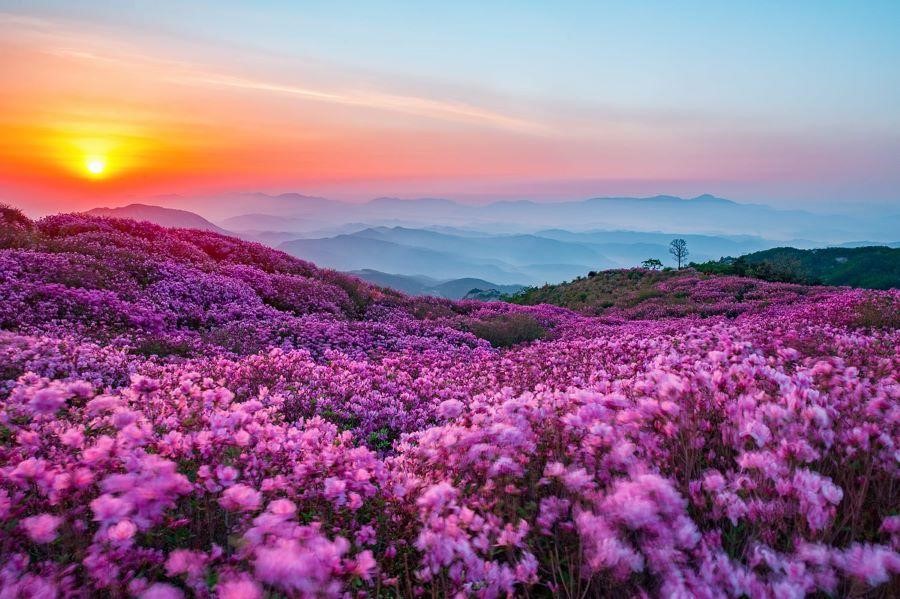Khi ghé thăm Hàn Quốc vào mùa hoa đỗ quyên, chắc chắn du khách sẽ choáng ngợp trước vẻ đẹp "kiêu kì" của những bông hoa đỗ quyên tuyệt sắc, nhuộm những vạt tím thủy chung, mộng mơ cho khắp cả những vùng đồi rộng lớn như Incheon, Gyeongsang…