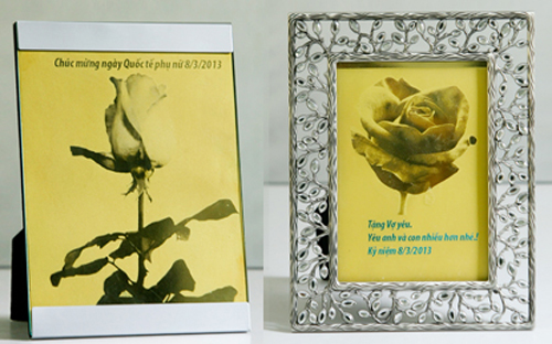 hoa hồng dát vàng được xem là món quà xa xỉ nhưng vẫn cháy hàng. Giá bán lên tới 6 triệu đồng một thiệp mạ vàng, 2 triệu đồng một bông hồng dát vàng 24k, nhưng vẫn có nhiều người đặt hàng làm quà tặng. Dịp 8/3 năm nay, những bông