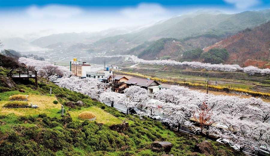 Lễ hội hoa anh đào nơi đây được diễn ra quanh Chợ Hwagae – nơi có những cây hoa anh đào dọc theo con đường dài 6 km từ chợ đến đền Ssanggyesa tạo nên một khung cảnh nên thơ, thu hút mọi ánh nhìn của tất cả mọi người. Người ta tin rằng nếu một cặp đôi nào nắm tay nhau đi dưới con đường này, họ sẽ cùng nhau già đi và bên nhau tới đầu bạc răng long. Vì lý do này mà con đường đôi khi được gọi với cái tên là “con đường hạnh phúc”.
