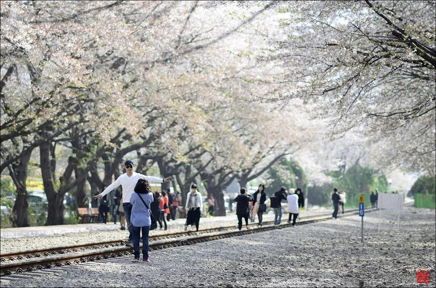 Jinhae Gunhang Festival diễn ra ở phường Dongsin, quận Jinhae, thành phố Changwon, tỉnh Gyeongnam. Lễ hội thu hút nhiều người dân ở mọi miền Hàn Quốc cũng như du khách quốc tế đổ về đây những ngắm hoa anh đào tuyệt đẹp nơi này. Địa điểm ngắm hoa anh đào đẹp nhất tại Jinhae là suối Jeojwa và ga xe lửa Kyeongwha, nơi bạn có nhìn thấy khung cảnh lý tưởng để ngắm hoa anh đào lãng mạn nhất vào mùa xuân. Do được trồng gần nhau nên khi nở rộ các tán hoa đan xen vào nhau như kết thành “đám mây hồng” trên lối đi vô cùng ấn tượng.