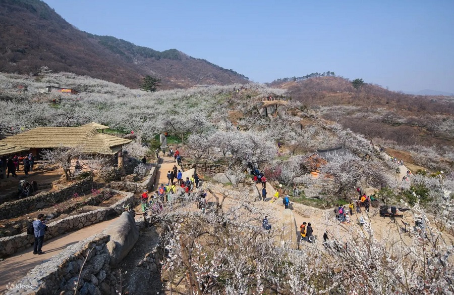 Lễ hội Gwangyang Maehwa là một sự kiện nổi bật tổ chức vào giữa tháng 3. Vì nằm cuối phía Nam đất nước nên thời tiết ở Gwangyang chuyển ấm sớm khiến hoa cũng nở sớm hơn so với các tỉnh phía Bắc. Nổi bật nhất ở đây đó chính là những cây hoa mận nở trắng xóa cả một vùng trời khiến không gian trở nên cực kỳ lãng mạn. Đến đây, du khách sẽ cảm nhận thật rõ sự yên bình, không xe cộ ồn ào mà chỉ có những ngôi làng cổ xinh đẹp (làng Seomjin và Gwangyang) trên sườn đồi. Bạn có thể chọn dạo quanh các cung đường mòn, len lỏi khắp các hẻm nhỏ để khám phá sắc hoa tươi đẹp đầy quyến rũ.