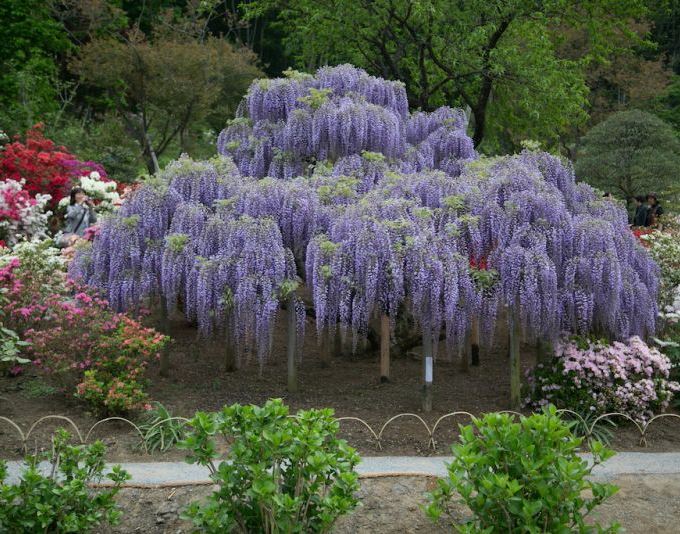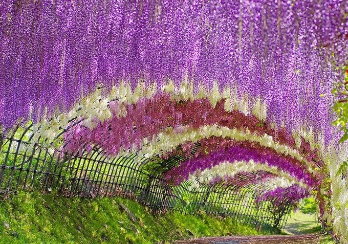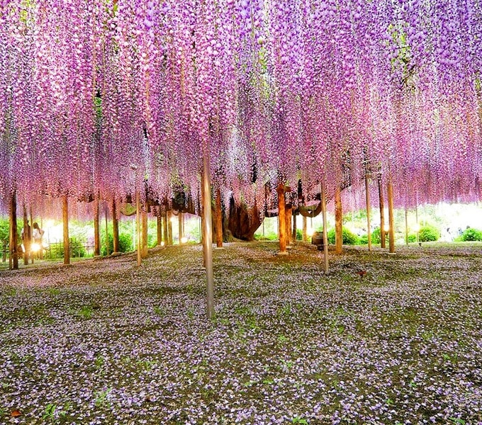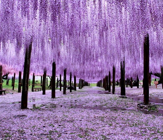 Khi đến Tokyo, Nhật Bản, người ta thường dành thời gian để đi dạo vòng quanh Tokyo với đền Minh Trị, Asakusa Temple, Tokyo Tree, hay xa hơn là đi núi Phú Sỹ. Với những người thích ngắm hoa lá cỏ cây thì thường chọn đến Tokyo 2 mùa – mùa xuân với hanami ngắm hoa anh đào, và mùa thu với momiji ngắm lá đỏ … Tuy nhiên, có 1 vườn hoa, đúng hơn là 1 công viên hoa vô cùng rực rỡ ở 1 thành phố lân cận Tokyo, rất đáng để viếng thăm vào những tháng mùa hè. Đó là công viên hoa tử đằng (wisteria) ở thành phố Ashikaga thuộc quận Tochigi, cách Tokyo chừng 2h đi tàu. Hoa tử đằng là loài hoa dây leo có nguồn gốc phía Đông nước Mỹ và Trung Quốc, Hàn Quốc, Nhật Bản. Hoa có khoảng 10 màu khác nhau, nhưng màu tím là màu đẹp nhất. Trồng hoa tử đằng, người ta không trồng từng cây mà làm thành từng thảm hoa, trên những bức tường, những vòm hoa hay giàn hoa cao trên đầu, tới mùa, hoa nở dài rũ xuống tạo thành khung cảnh vô cùng xinh đẹp, và công viên Ashikaga là công viên có những thảm hoa đủ màu sắc thu hút hàng triệu du khách mỗi năm về ngắm hoa. Tên tiếng Anh của tử đằng là wisteria, nhưng ở Nhật, người ta gọi đây là hoa fuji.