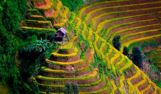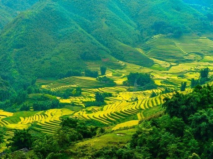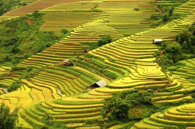 Những ngọn đồi hình bậc thang cùng những ruộng lúa xinh đẹp khiến bao du khách ngỡ ngàng[/caption] Vào thời điểm này, trải dài ngút tầm mắt sắc vàng tươi của những thửa ruộng lúa vào độ chín xen lẫn sắc nâu của những thửa ruộng đã gặt xong xuôi. Trên các triền đồi chập chùng nối tiếp nhau đến ngút tầm mắt, lúa uốn câu, trĩu nặng, phủ kín một màu vàng óng ả, thấp thoáng giữa cánh đồng là những căn chòi gỗ nhỏ canh lúa, tạo thành một bức tranh phong cảnh đẹp tuyệt vời. [caption id="attachment_67326" align="alignnone" width="680"]