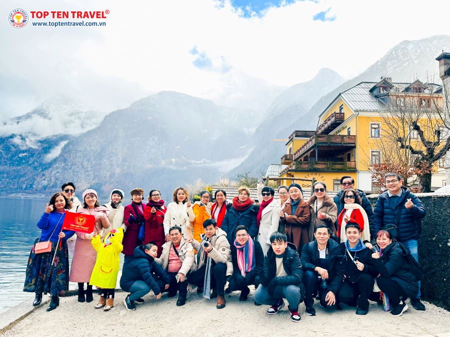 Đoàn tản bộ quanh Marktplatz Hallstatt được bao quanh bởi những ngôi nhà gỗ sắc màu, ban công phủ đầy hoa cùng nhiều quán cà phê ấm cúng tạo nên khung cảnh như bước ra từ tranh vẽ.