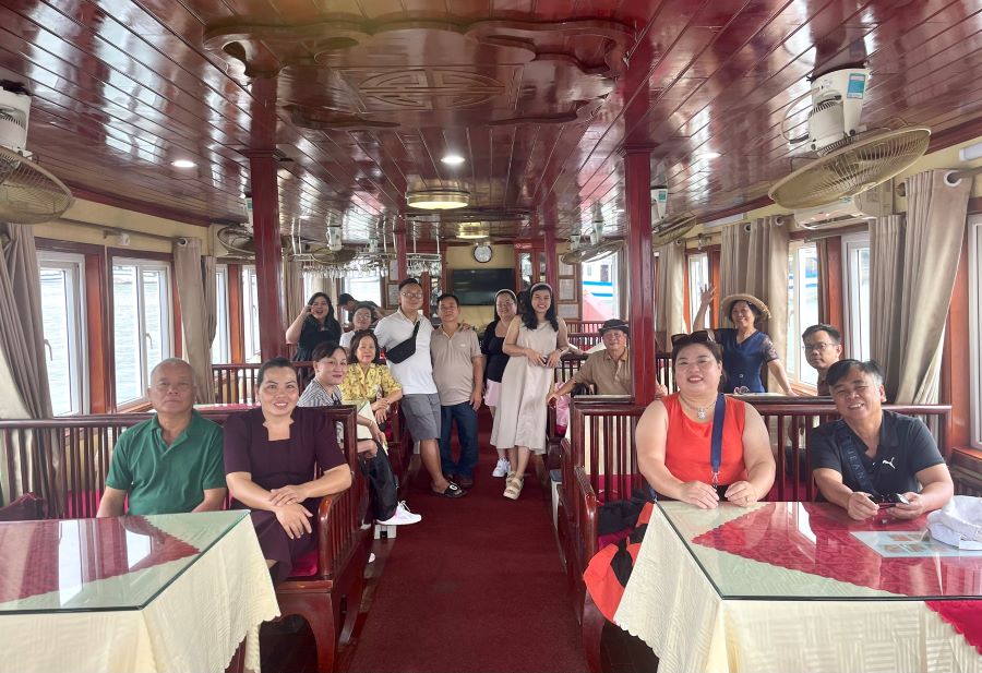 12:30: Quý khách sẽ di chuyển tới du thuyền bằng tàu truyền tải, quý khách được mời đồ uống chào đón và dùng khăn. Quản lý du thuyền sẽ phổ biến chung về các quy định an toàn trước khi quý khách nhận phòng